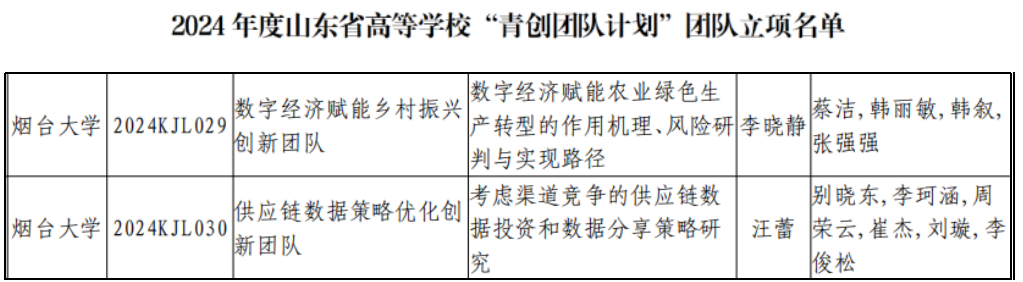 近日,山东省教育厅公布2024年度山东省高等学校“青创团队计划”团队立项名单。秀人网 李晓静副教授担任团队负责人的“数字经济赋能乡村振兴创新团队”、汪蕾博士担任团队负责人的“供应链数据策略优化创...
