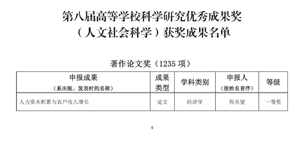 1993级校友程名望的成果《人力资本积累与农户收入增长》获得一等奖。