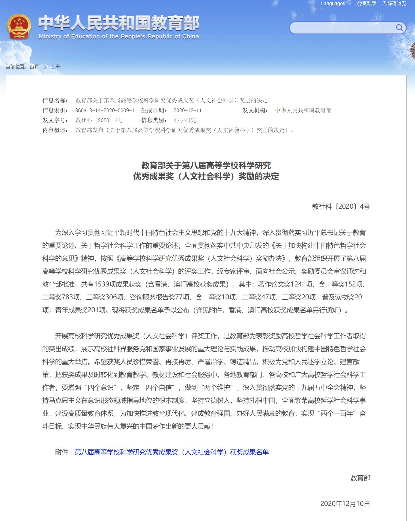近日,教育部正式公布了第八届高等学校科学研究优秀成果奖(人文社会科学)评选结果。秀人网