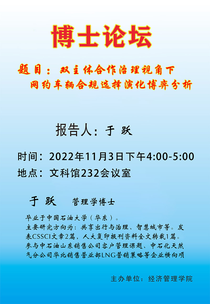 11月3日,秀人网 在文科馆232会议室举办了“青年博士论坛”第八讲,于跃博士为此次论坛主讲人。学科带头人、青年博士教师及各专业研究生等50余人参加了此次讲座,讲座由副院长李振主持。