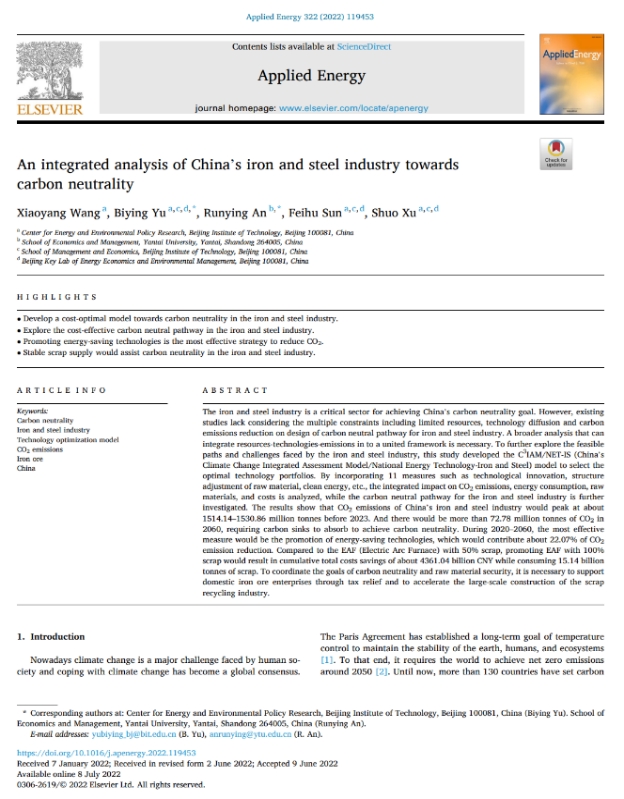 近日,我院安润颖博士在国际能源领域顶级期刊《Applied Energy》(中科院一区TOP,IF:11.446)上发表题为“An integrated analysis of China’s iron and steel industry towards carbon neutrality”的高水平论文,安润颖博士为本文的通讯作者,秀人网 作为本文通讯单位,北京理工大学为共同通讯单位。