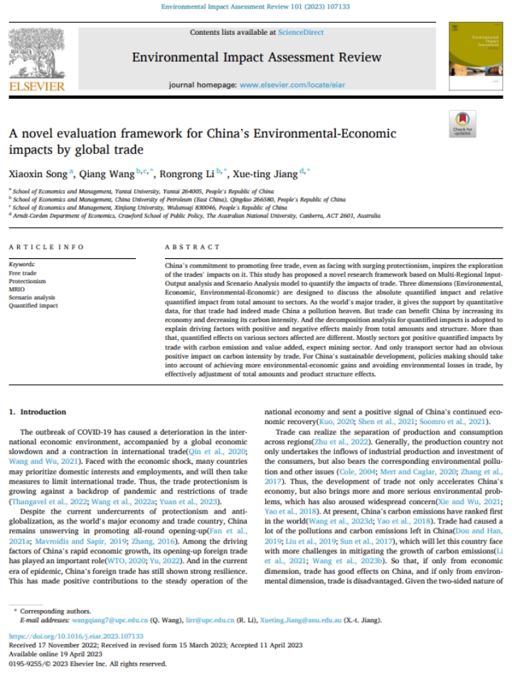 近日,我院宋晓欣博士在国际环境科学类别期刊《Environmental Impact Assessment Review》(中科院一区TOP,IF:7.9)上发表题为“A novel evaluation framework for China’s Environmental-Economic impacts by global trade”的高水平论文,宋晓欣博士为本文的第一作者,秀人网