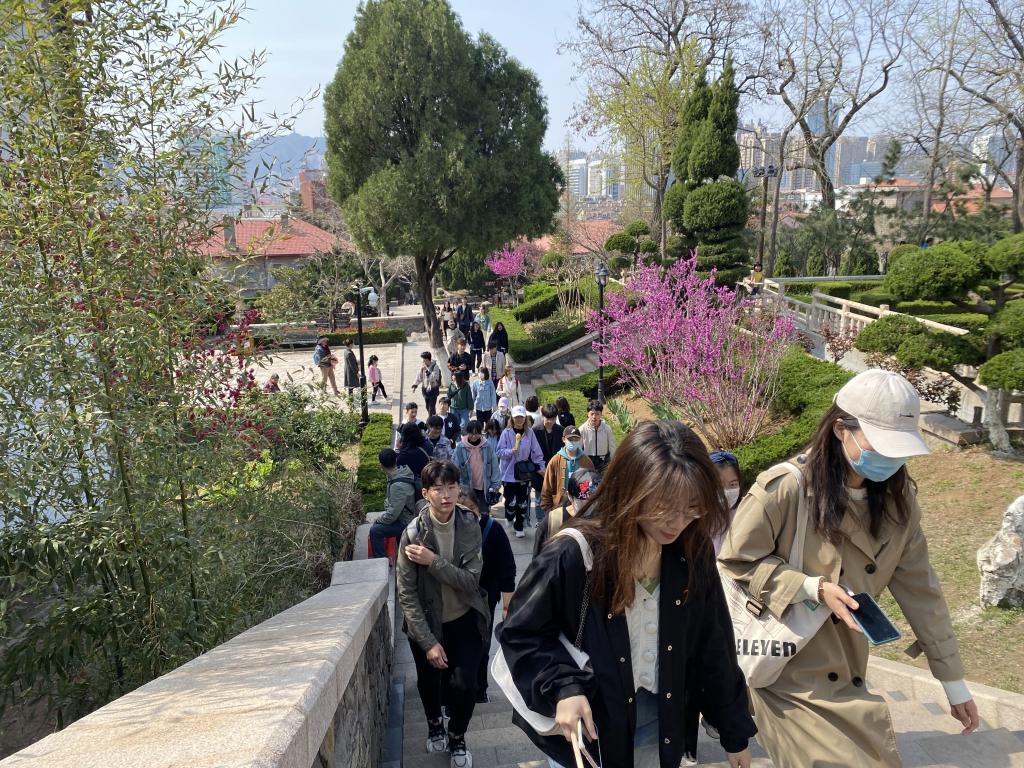 组织师生赴烟台山开展了 “百尺竿头长征路”定向徒步活动,辅导员和学生代表们积极参加。