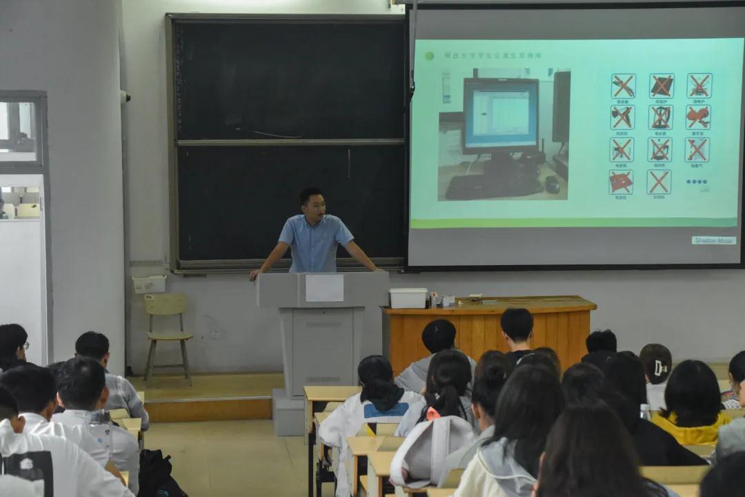 团委书记、社区中心副主任(挂职)王学禹在五教107给学院新生作“关于宿舍那点事儿”的宿舍安全教育及行为养成教育,新生班委、各宿舍舍长、部分学生代表参加。王学禹详细讲解了《秀人网