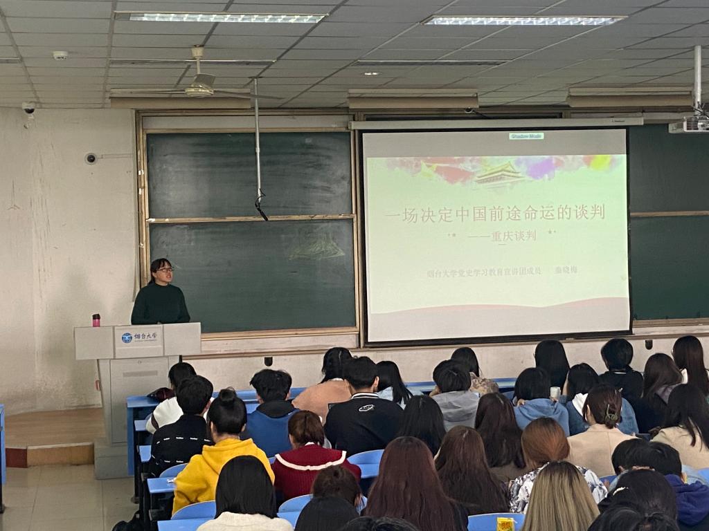 秦晓梅带领同学们重温重庆谈判这一伟大历史事件。她围绕着谈判背景、谈判过程、历史意义进行详细的讲解和阐释,如数家珍、娓娓道来,既有理论高度,又有情感温度。同学们沉浸其中,深度领会重庆谈判斗争的复杂性和伟大的价值意义,学习并汲取共产党人坚持底线思维、防范化解重大风险的宝贵经验;深刻领悟面对严峻恶劣的国际境遇和纷繁复杂的国内形势,共产党人舍生取义视死如归、保卫国土不辱使命的高贵品质。