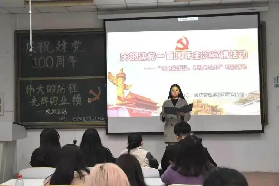 形式新颖多样,学习氛围浓厚。学院组织学生观看《建党伟业》《国家相册》等红色影片,在观影中触摸风云激荡的历史体温,接受思想洗礼、淬炼政治坚定;艺术团组织开展“欢歌新时代、颂歌献给党”文艺汇演活动,在唱响《没有共产党就没有新中国》《走向复兴》《东方红》等歌曲中重温经典旋律,讴歌时代精神,激发昂扬斗志,鼓劲拼搏热情。舞蹈团的同学们用优美的舞姿和创意的编排共同演绎红歌《一条大河》,表达不忘初心、继往开来的使命和决心,展现当代青年奋进新征程、担当新作为、焕发新气象的精神风貌。